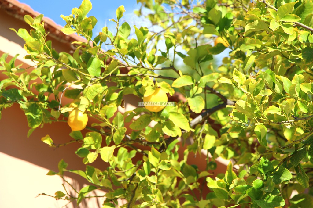 Zitronenbäumen, Palmen und Blumen.